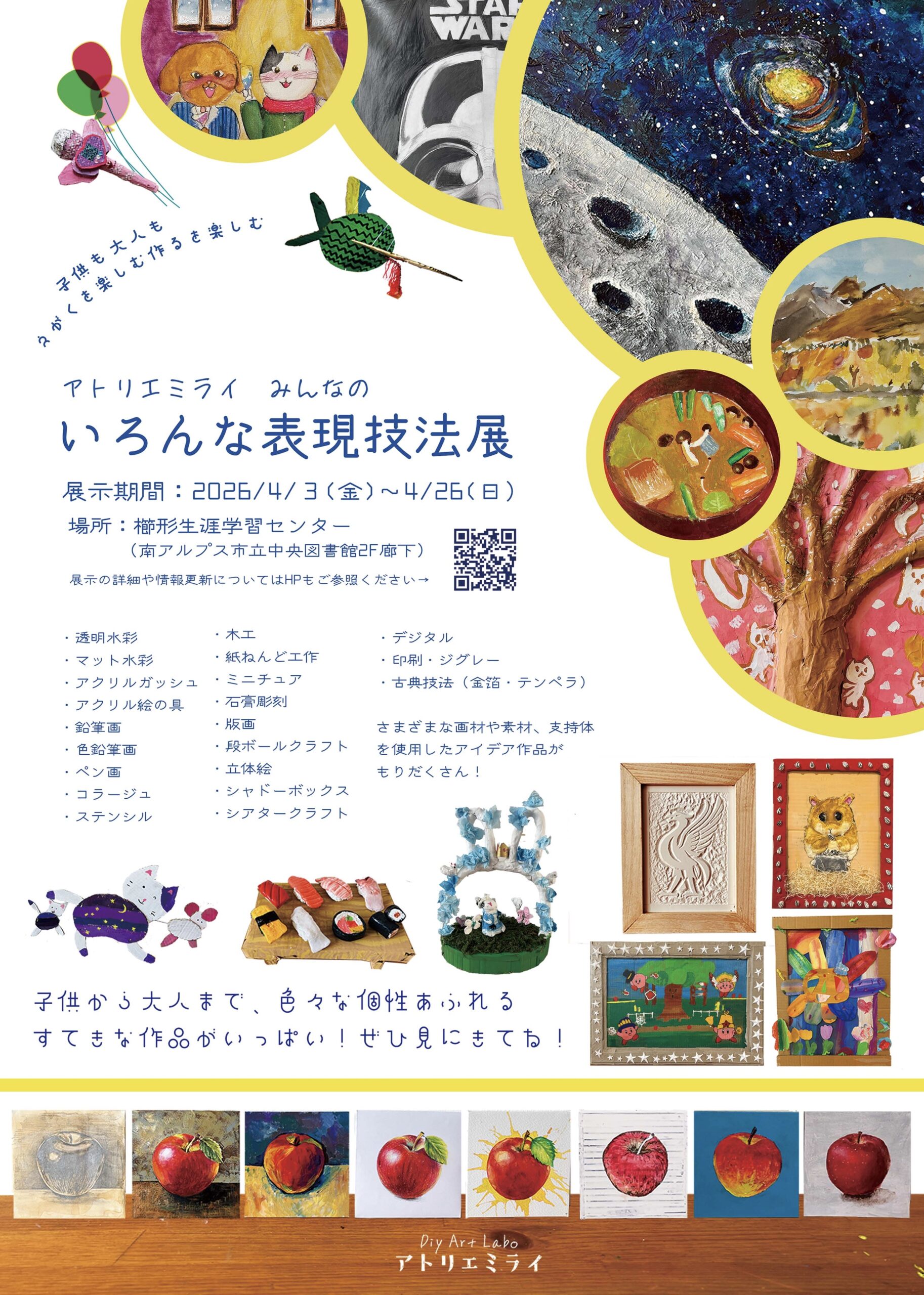 今年2026年も4月にアトリエの展示を 生涯学習センター 市民ギャラリー(南アルプス市の中央図書館2階廊下)にて開催いたします。